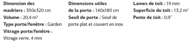 Abri de jardin toit plat 9.6 m² 28 mm A : 211 cm B : 221 cm Dimension Caractéristiques du produit DEMANDER DEVIS